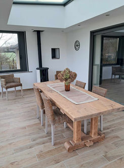 Au rez-de-chaussée, vous y découvrirez un Séjour avec espace repas ouvert sur le salon avec canapé 3 places, 2 fauteuils, pouf et TV 120cm